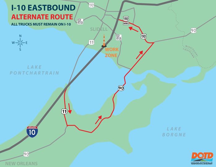 ST. TAMMANY PARISH, La. – The Louisiana Department of Transportation and Development announces upcoming, double lane closures on Interstate 10