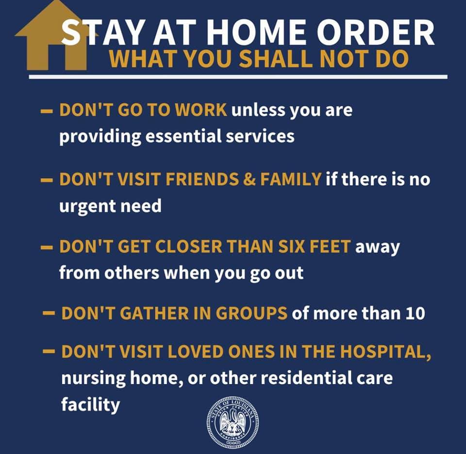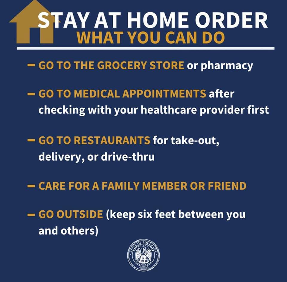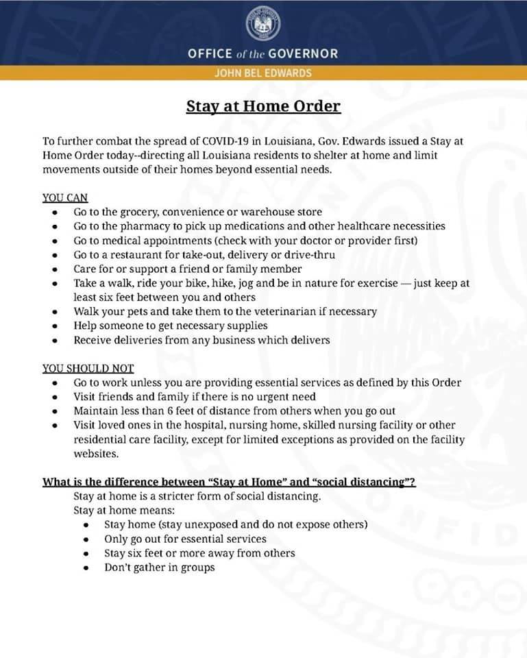 In an effort to further fight the spread of COVID-19, Louisiana Governor John Bel Edwards has issued a “Stay-at-Home” order for the entire State of Louisiana effective Monday, March 23 beginning at 5 p.m.