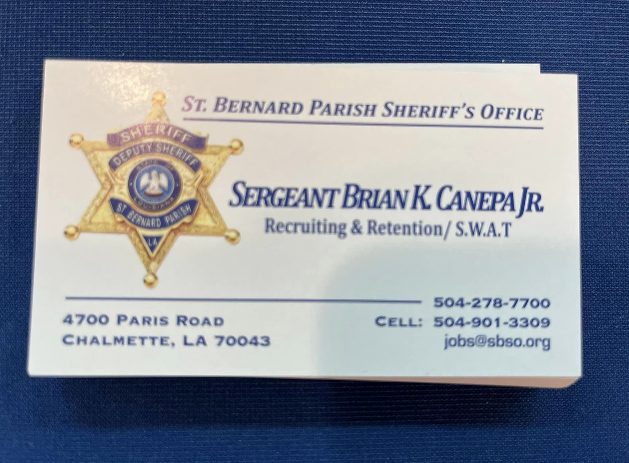 SBSO at CHS job fair tonight Considering a career move? Interested in working in law enforcement? Think you have what it takes to be a great cop? Stop by SBSO’s booth at Chalmette High School’s College and Career Night this evening from 6 to 8 p.m. in the main campus cafeteria, 1101 E. Judge Perez Drive in Chalmette. Our deputies will be happy to tell you what SBSO can offer you, and answer any questions you may have about why it’s a great place to work. From left, are: Capt. Michael Ingargiola, Sgt. Brian Canepa (Recruiter), Dep. Paradise Donaldson and Dep. Harrison Paluska. Can’t make it tonight? Apply today at www.sbso.org/careers/ or To be contacted by a recruiter: www.sbso.org/job-inquiry/