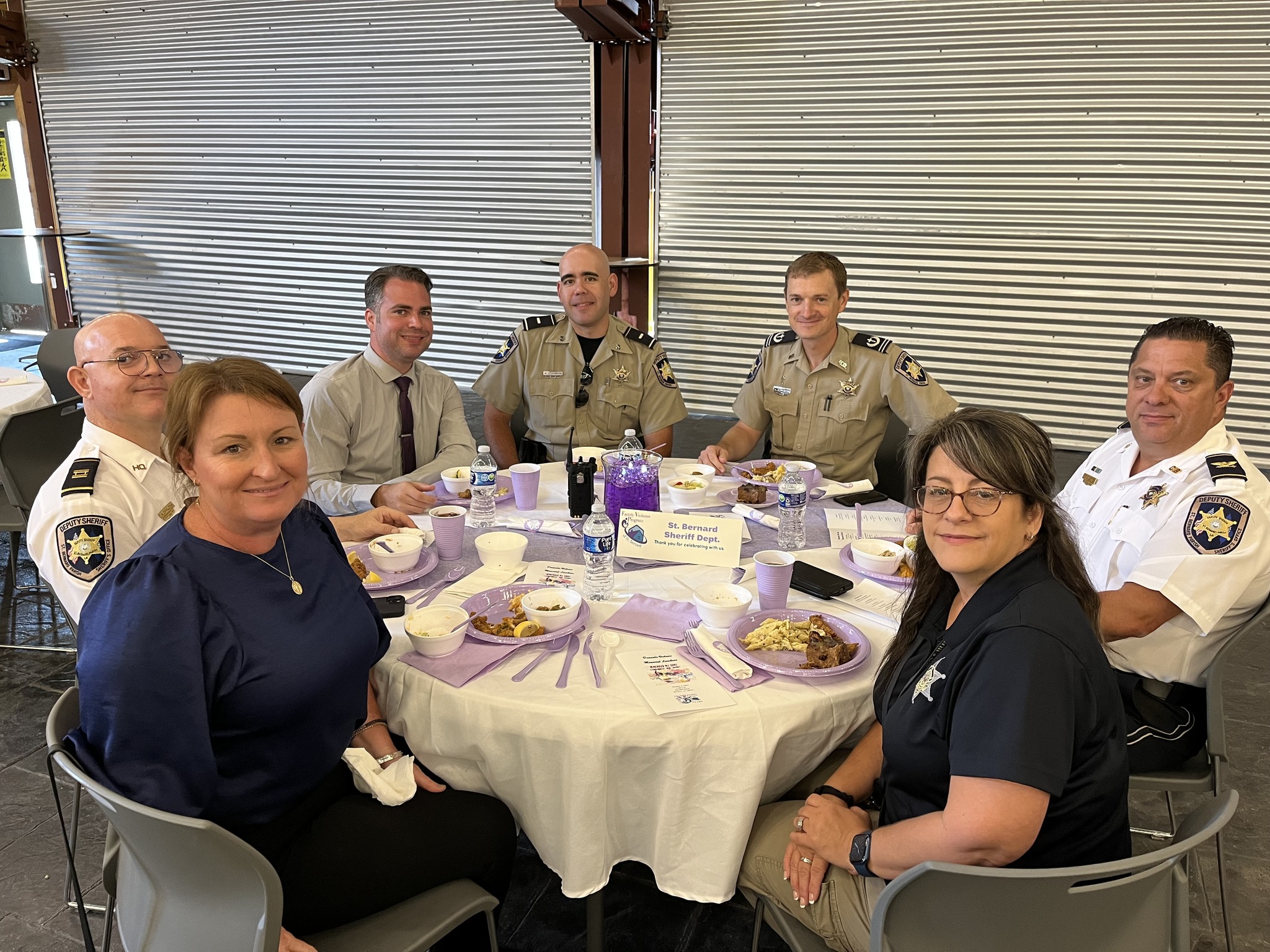 Those from SBSO in attendance at today’s fundraiser included: Col. Chad Clark, commander of the Criminal Investigations Bureau and chief of detectives; Capt. Dennis Morgan, director of the St. Bernard Juvenile Detention Center and a Family Violence Program of St. Bernard board member; Capt. Adrian Chalona and Lt. Warren Chambon of the Corrections Division at St. Bernard Parish Prison; Lt. Jennifer Gutierrez of the Criminal Investigations Bureau; Dep. Aaron Johnson, SBSO chaplain; and Public Information Officer Kim Gritter.
