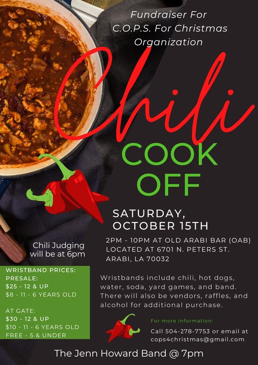 This year, a chili cook off fundraiser will be held Saturday, Oct. 15 from 2 to 10 p.m. at Old Arabi Bar, 6701 N. Peters Street in Old Arabi. The judging will be held at 6 p.m.