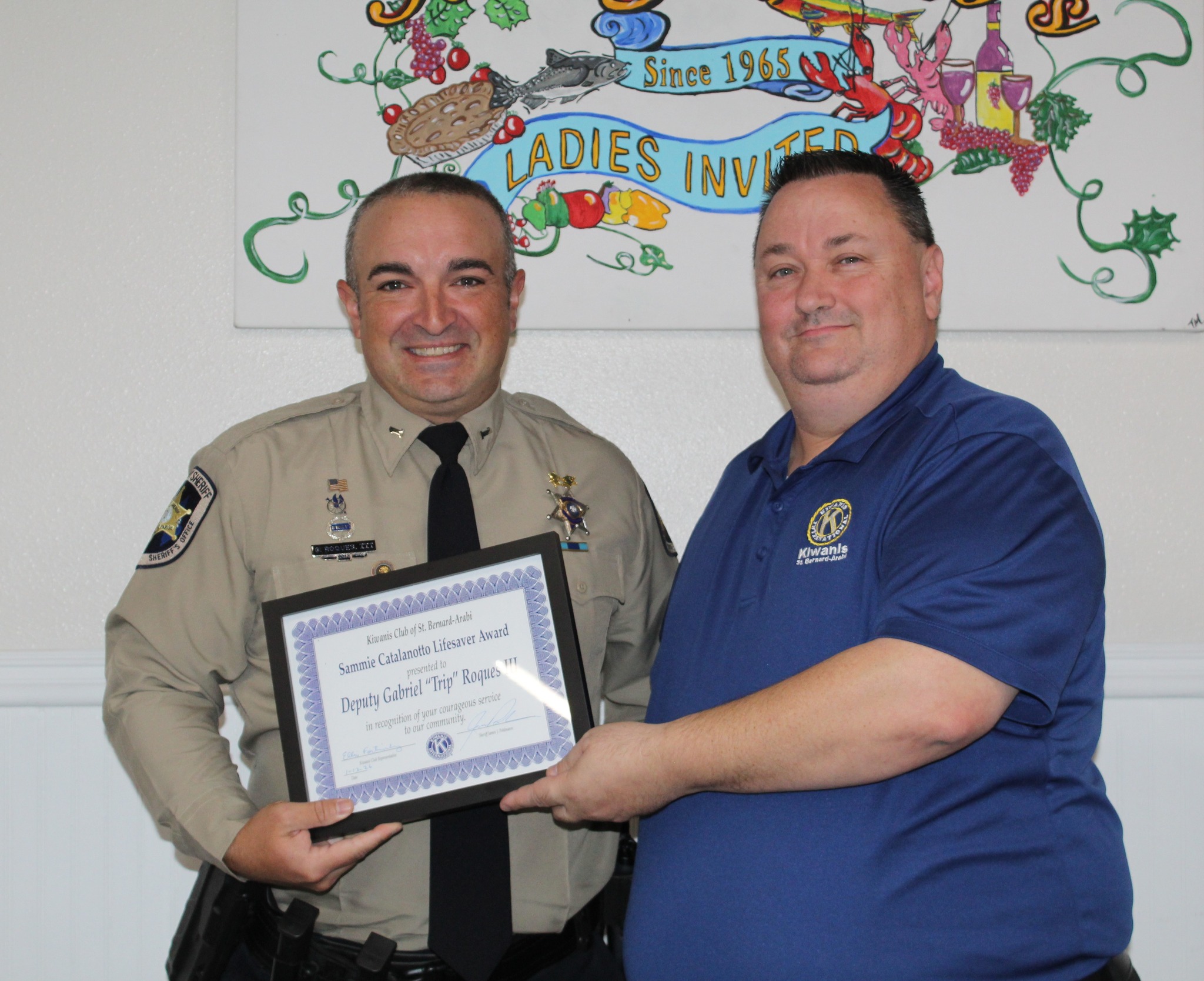 St. Bernard Sheriff’s Office Dep. Gabriel “Trip” Roques III received the prestigious Kiwanis Club of St. Bernard Sammie Catalanotto LifeSaver Award for his heroic actions that helped save a man’s life, Sheriff James Pohlmann said.