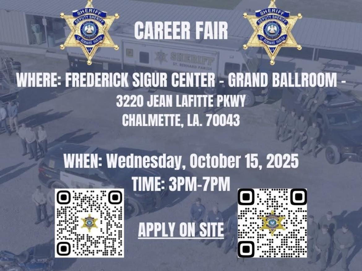 Stop by the SBSO Job Fair TODAY from 3 to 7 p.m. in front of the Frederick J. Sigur Civic Center (8245 W. Judge Perez Dr., Chalmette) on the Jean Lafitte Parkway side!