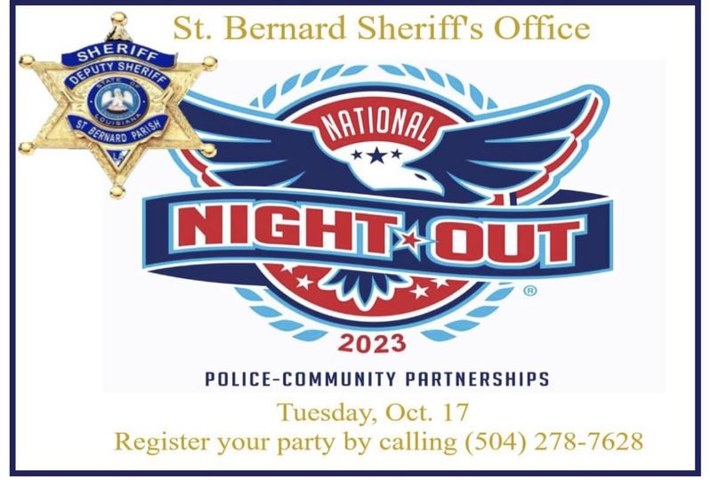 St. Bernard residents who plan to host a Night Out party are asked to register their gathering as soon as possible with the St. Bernard Sheriff’s Office by calling Lt. Eric Eilers, head of Community Relations, at (504) 278-7628.