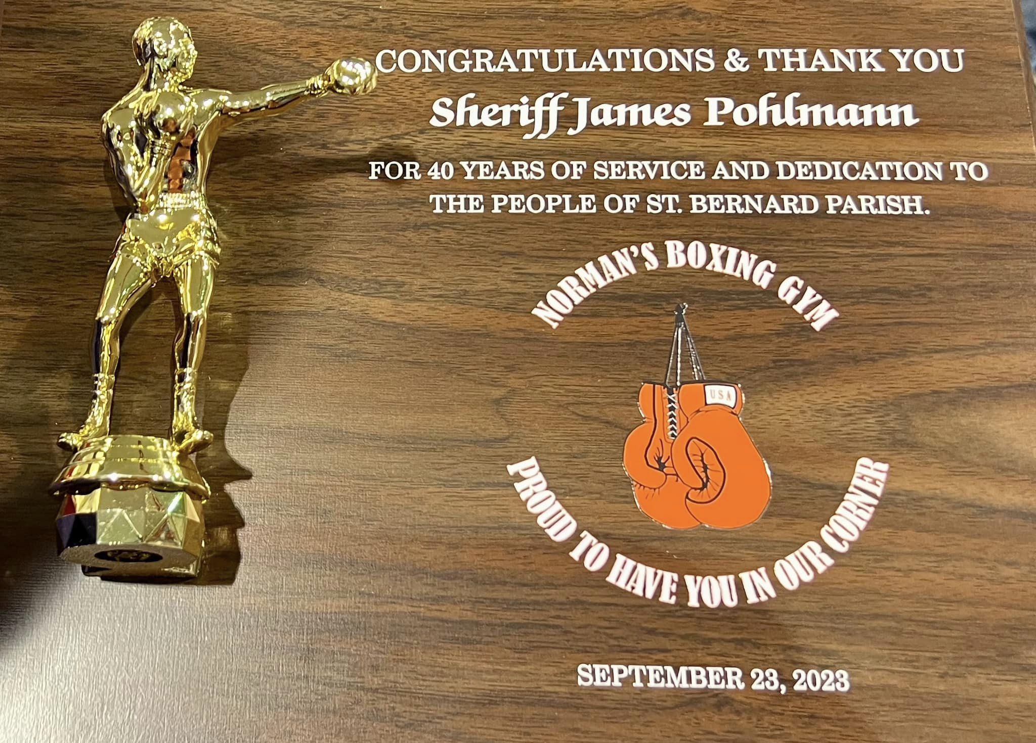SHERIFF POHLMANN HONORED AT BOXING EVENT Thank you, Norman’s Boxing Gym, for honoring Sheriff Pohlmann for 40 years of service and dedication to the people of St. Bernard during tonight’s “Hittin Hard ‘N’ St. Bernard” boxing event. We are glad he’s in our corner, too!! 👍 And congratulations to all of the boxers who got to showcase their hard work, dedication to their sport and athleticism. 💪🏼