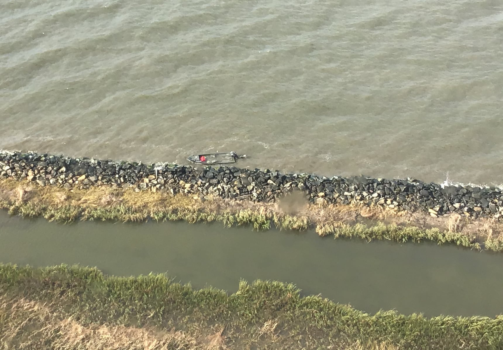 Less than one hour from when they first received a call for help, members of the Marine Division were able to locate the man and woman on the south shoreline of Lake Borgne close to Doulut’s Canal, standing on the rocks wearing their life jackets as instructed.