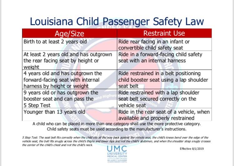 The Sheriff also would like to make residents aware of the new laws for vehicle child safety restraints which went into affect Aug. 1. Please see the attached chart with the new laws according to Louisiana State Bill 76.